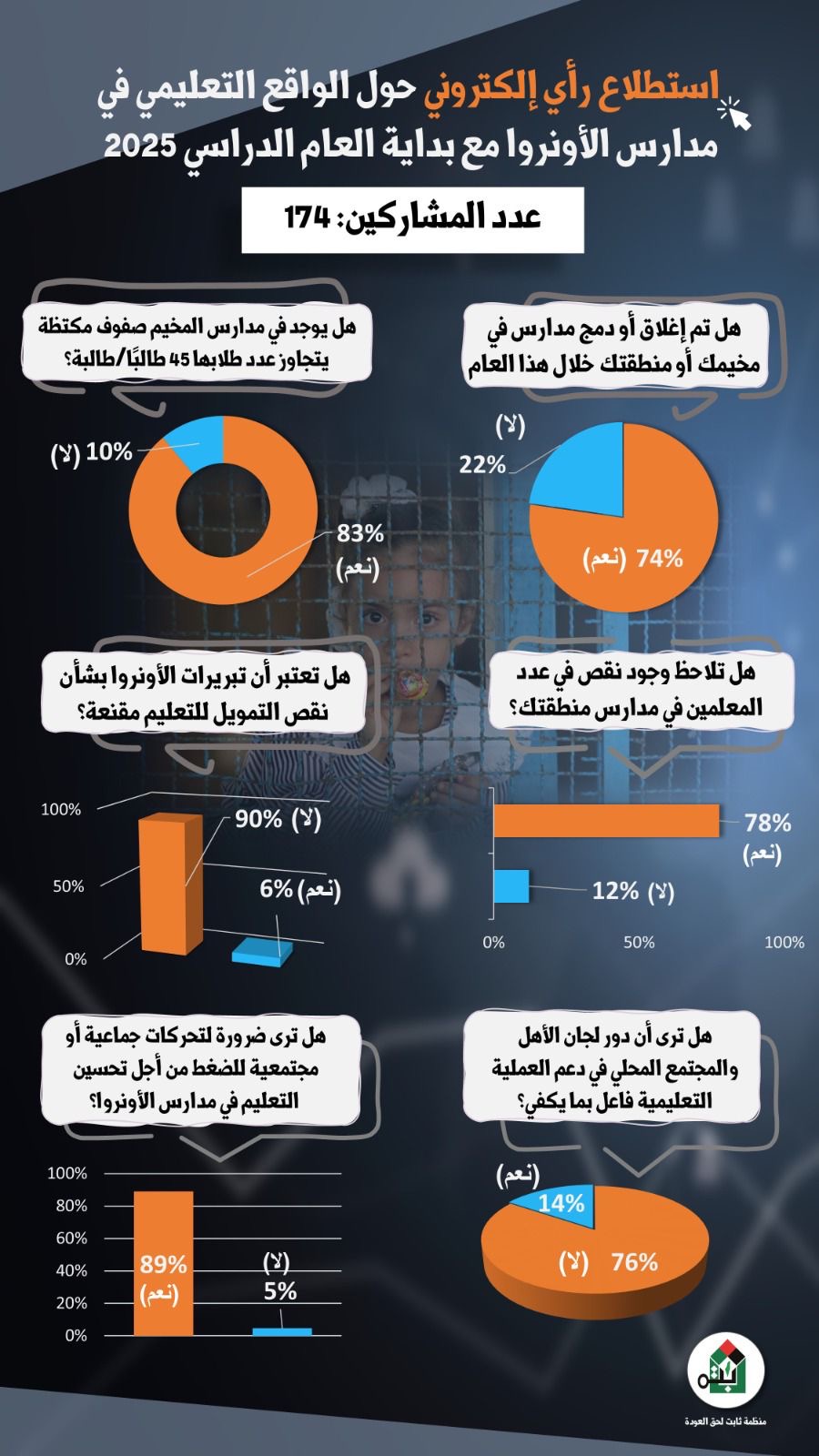 أكمل القراءة »*واقع التعليم في مدارس الأونروا بلبنان: استطلاع لـ «ثابت» يكشف أزمة متفاقمة وثقة تتراجع* *بيروت – خاص، لاجئ نت|| الإثنين، 01 كانون الأول، 2025* يكشف استطلاع حديث أجرته منظمة ثابت لحق العودة، وشارك فيه 174 لاجئًا فلسطينيًا من مختلف المناطق اللبنانية، عن صورة قاتمة لواقع التعليم في مدارس وكالة …