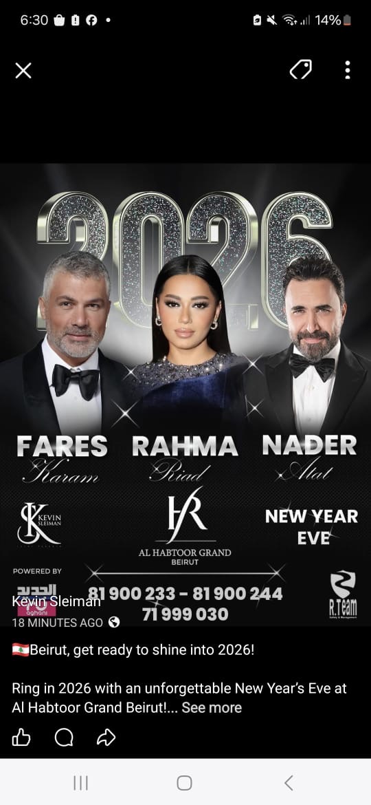 تستعد بيروت لاستقبال عام 2026 بسهرة استثنائية تجمع ثلاثة من أبرز نجوم الساحة الفنية: فارس كرم، رحمة رياض، ونادر الأتات، وذلك في فندق الحبتور غراند بيروت، ضمن حفل يُعتبر من أقوى سهرات ليلة رأس السنة لهذا العام. الحدث يحمل توقيع متعهد الحفلات كيفين سليمان، الذي بات اسمه مرادفًا للتنظيم …