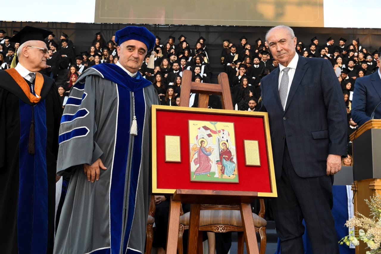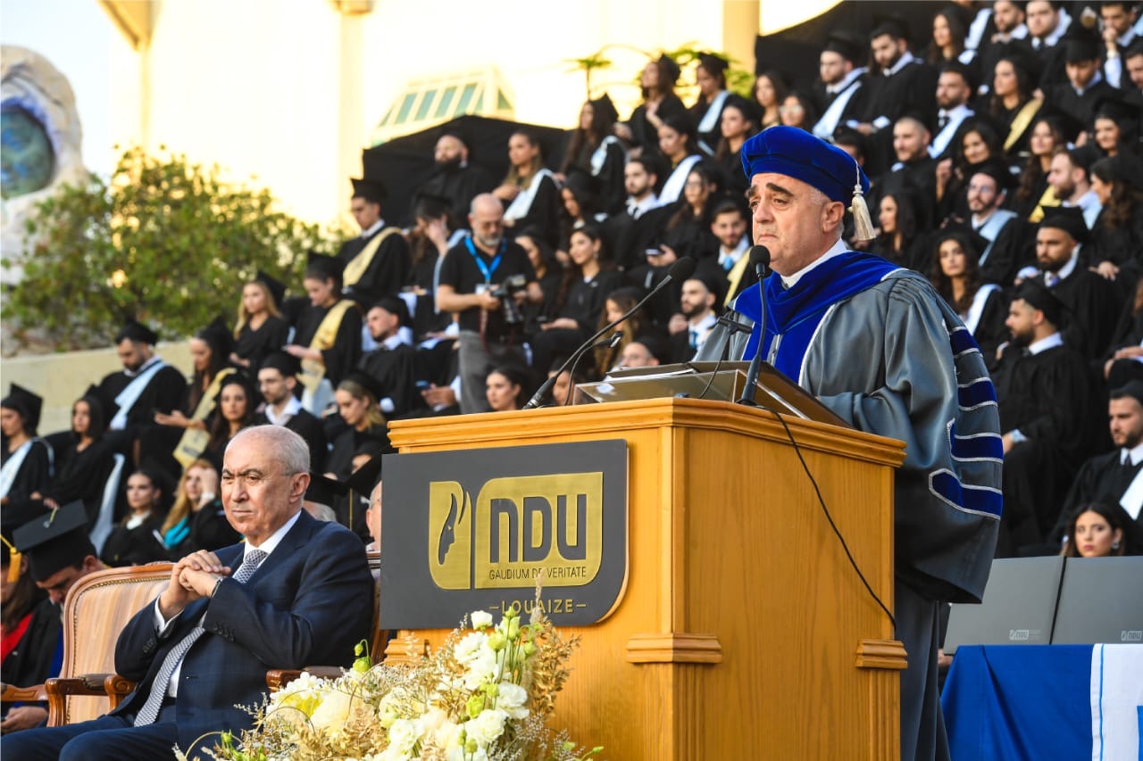 وقال:”نحن اليوم في رحاب جامعةٍ لا تكتفي بالتعليم، بل تفتخر بأرقى الاعتمادات الأكاديمية التي تُثبت جودة التعليم فيها وتألّقها العلمي والثقافي. هي جامعةٌ منفتحةٌ على الحضارات والطوائف والأديان، تؤمن أن المعرفة نور، وأن النور حق لكل إنسان، تؤمن بالجودة، وتخدم طلابها بضمير رسولي، ومؤتمنةٌ على تراثها المارونيّ اللبنانيّ المريميّ اللويزيّ، تراثٍ صان الهوية وحافظ على القيم، ورسّخ أن العلم رسالة، وأن للجامعة دورًا أعمق من منح الشهادات.”