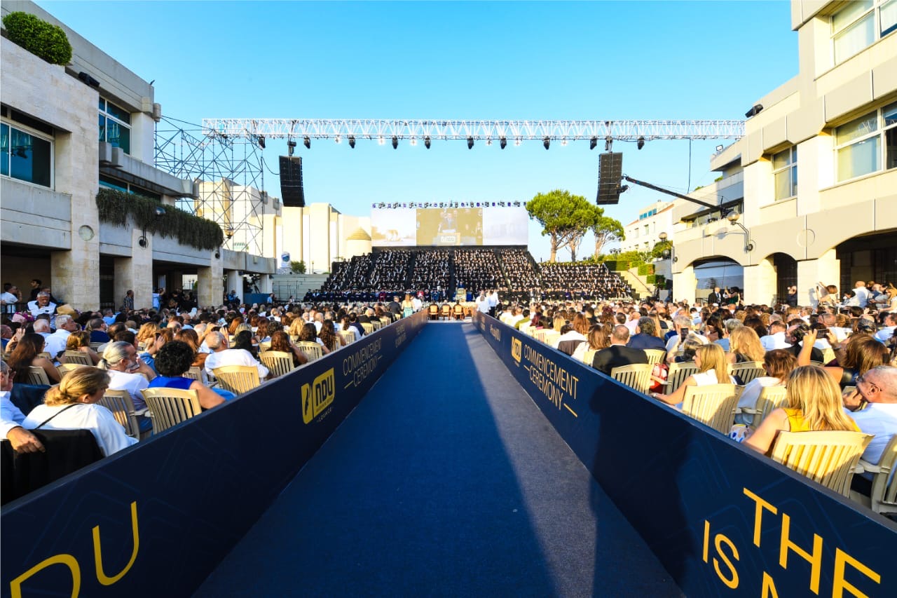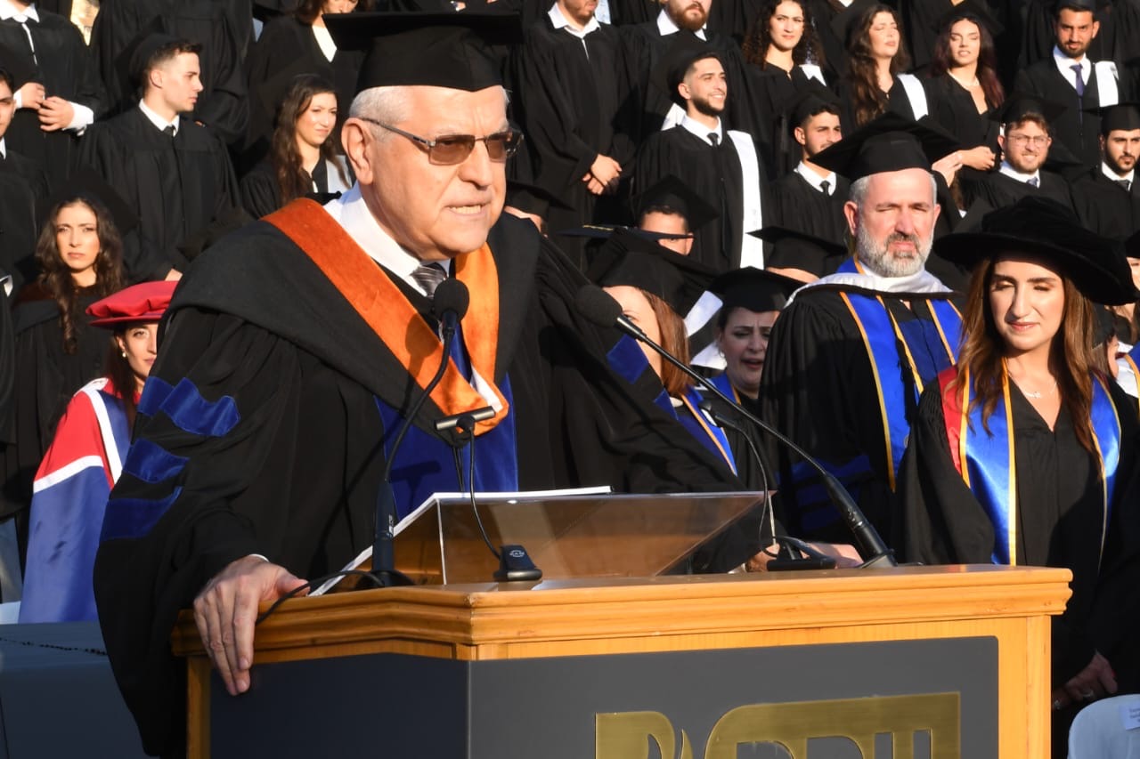 ليختم الأب الرئيس: ” العالَمُ لَكُم… هيّا انطلقوا وانجحوا حيْثُ فَشِلَ كثيرون. إذهبوا أقوياءَ، فالجامعة مكَّنَتْكُم وأعْطَتْكُم ما تحتاجونَ إليهِ لمواجهة تحدّيات العصرِ وفي مُقَدِّمِها الذكاءً الاصطناعيّ المطلوب استثماره بذكائِكُم الطبيعيّ. الجامعة رَفَعَتْ مناعَتِكُم الفِكريّةِ لتكونوا روّاداً وقادةً وَصُنّاعَ حداثةٍ ومستقبل. لا ترضَوا بأن تكونوا سلعةً للتصديرِ أو للبيعِ في الأسواقِ. كابروا واعرفوا قيمةَ أنفُسِكُم وأهميّةَ الشهادةَ التي ستتسلّمون بعد قليلٍ، ولتكُنْ جوازَ سَفَرِكُم وعُبورِكُم إلى الابداع والتألق. كونوا أرقاماً صعبةً في شتّى معادلاتِ التغيير وكونوا أبرز اللاعبين على حَلَبَةِ التفوّق… هيّا انطلقوا، اجتاحوا العالمَ، فالعالمُ لَكُم”.