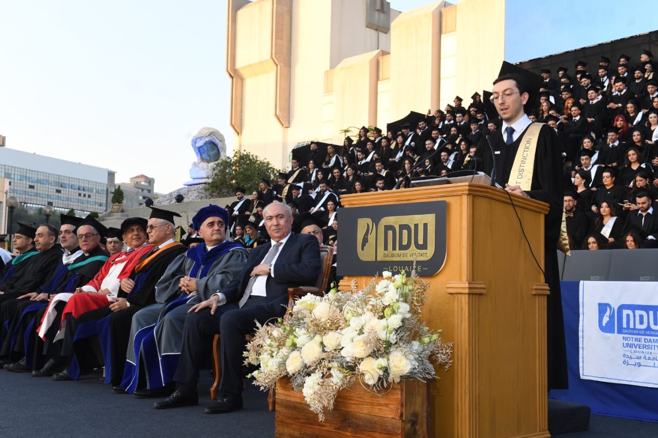 بدوره، شكر طليع الدورة، الطالب سيرج روسياليان من كليَّة العلوم الطبيعيَّة والتطبيقيَّة، جامعة سيّدة اللويزة إدارةً وأساتذة، وقال:” أعبّر عن فخري وامتناني لوقوفي بينكم في هذه اللحظة الاستثنائية التي تؤكد أننا لا نحتاج ظروفًا مثالية لنواصل التقدّم في الحياة. فرغم التحديات، ما زلنا نحلم حاملين شهاداتنا وقيمنا معًا. فاليوم يبدأ فصل جديد في حياتنا، مُفعم بالأمل، لكن من الطبيعي ألا نعرف كل خطواتنا بعد، فهذه المَرحلة مخصصة للاستكشاف والنضوج الفكري”.
